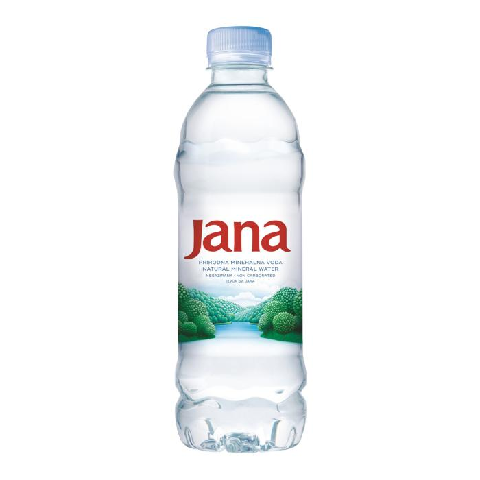 100% prírodná nesýtená minerálna voda s jedinečným a mimoriadne vyváženým minerálnym zložením obohatená o vápnik a horčík v ideálnom pomere 2:1. Obsahuje tiež oxid kremičitý, ktorý prispieva k zdravšej pleti, vlasom a nechtom. Popri ideálnej hodnote pH 7,4 má nízky obsah sodíka. Jana prírodná minerálna voda vyviera zo srdca pohoria Sv. Jany, z hĺbky 800 m. Neupravovaná. Zdroj: St. Jana, Gorica Svetojanska, Chorvátsko. Obsah katiónov (v mg/l): Vápnik Ca2+ 62,1