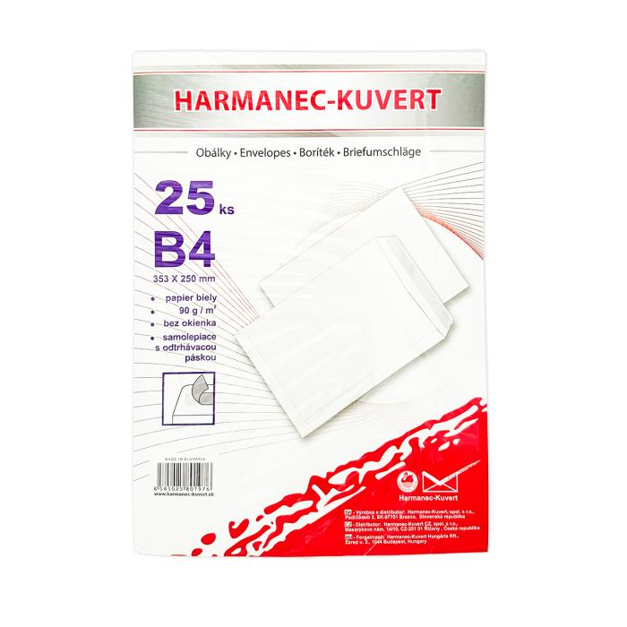 Obálky rozmeru 353 × 250 mm, vyrobené z bieleho bezdrevného papiera, otvor na kratšej strane, 90 g/ m2. Farba biela. Lepenie páskou.
