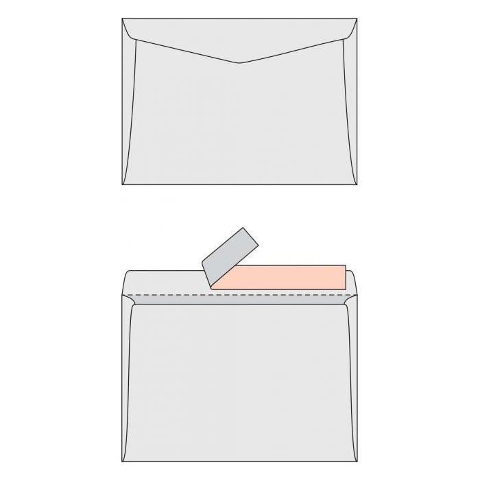Biele obálky rozmeru 162 × 229 mm, vyrobené z bezdrevného papiera, 80 g/ m2. S odtrhávacou páskou.