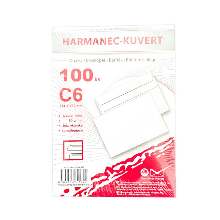 Biele obálky rozmeru 114 × 162 mm, vyrobené z bezdrevného papiera, 80 g/ m2. Samolepiace.