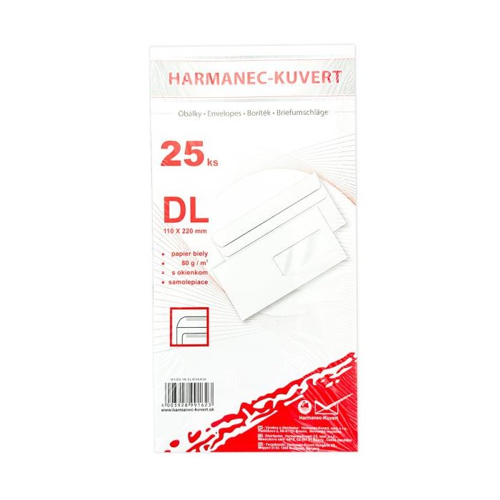 Biele obálky rozmeru 110 × 220 mm, vyrobené z bezdrevného papiera, 80 g/ m2. Samolepiace s okienkom z priehľadnej fólie vpravo.