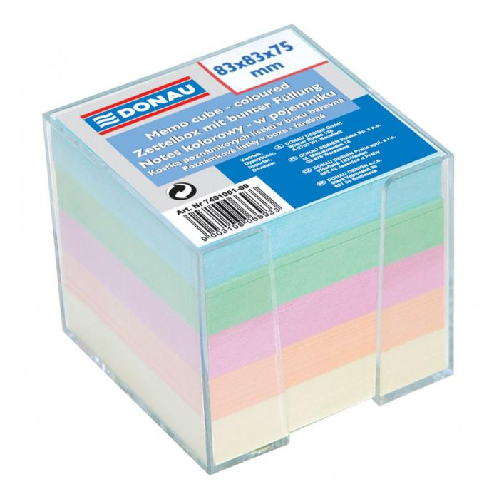 Poznámkový bloček kocka nelepená, 83x83x75 mm, pastelové farby, číra krabička